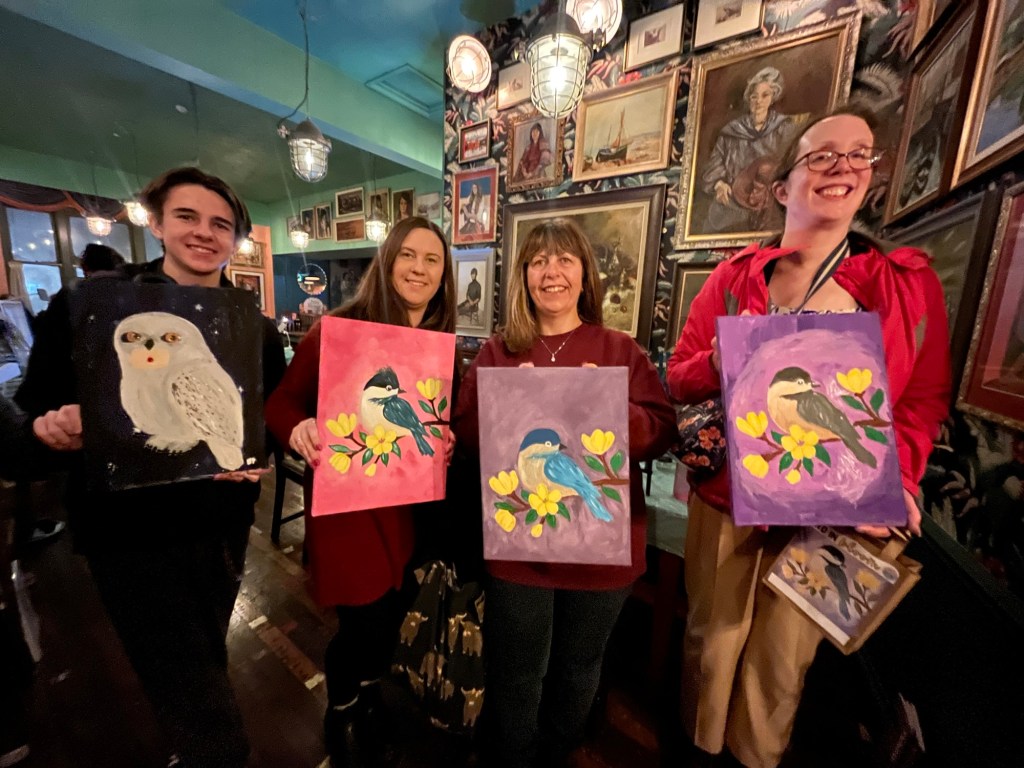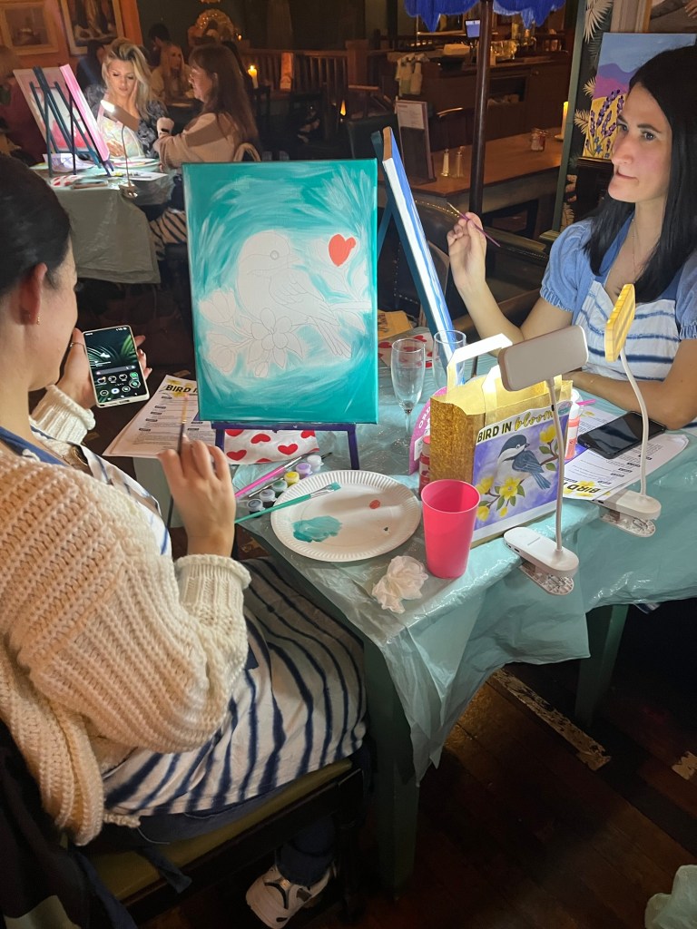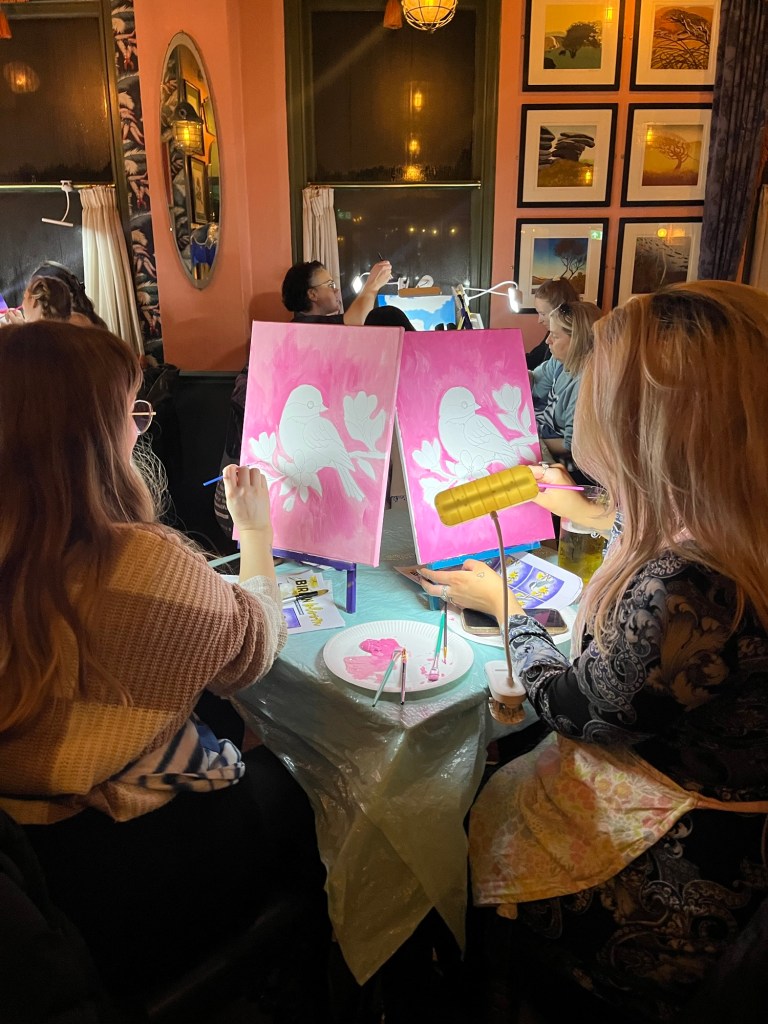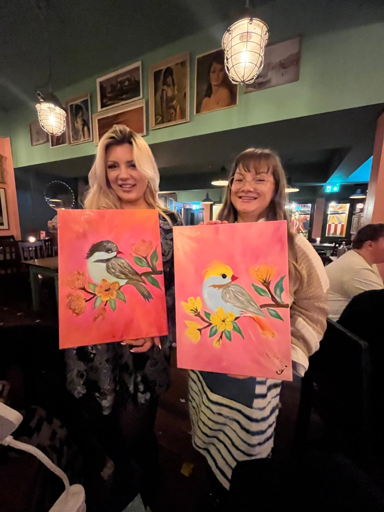 Our Love Birds evening at Truro Lounge, welcomed a lovely mix of people enjoying a creative date night or friends celebrating Galentine’s together. From partners trying something new to best friends ready for a night of chatting, laughing, and painting side by side, the room quickly filled with warmth, colour, and happy energy.