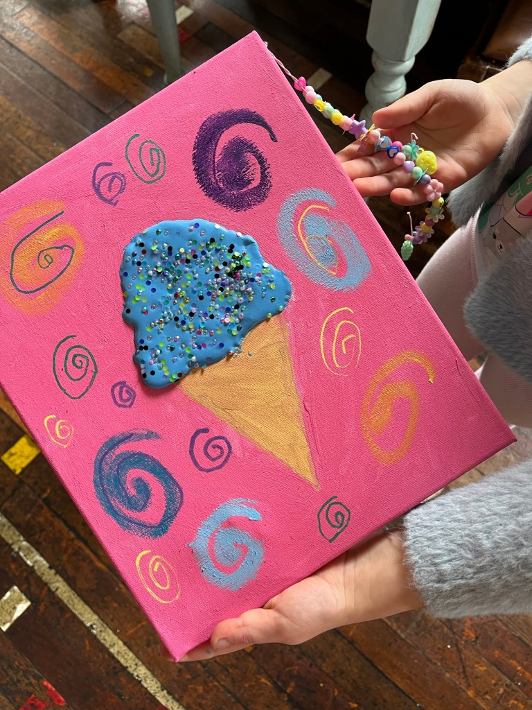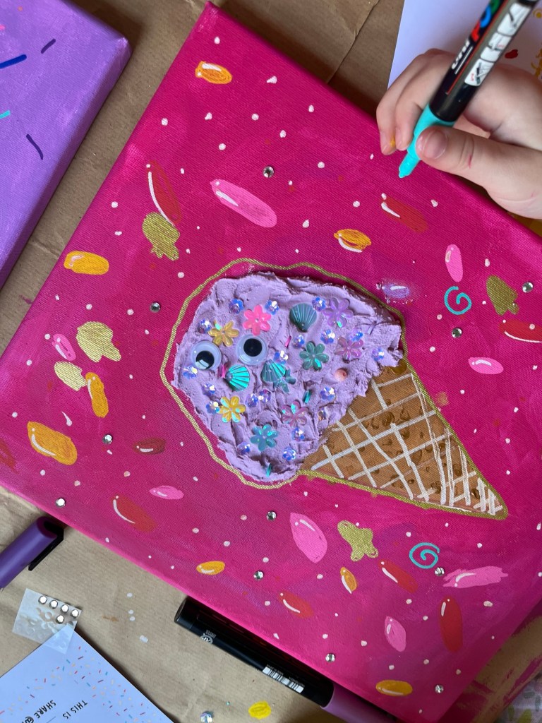 From the moment the children arrived, the space was transformed into a pastel dream. Think soft pinks, mint greens, and sprinkles everywhere! Each child had their own wrapped canvas, ready to create their very own ice cream-inspired masterpiece.