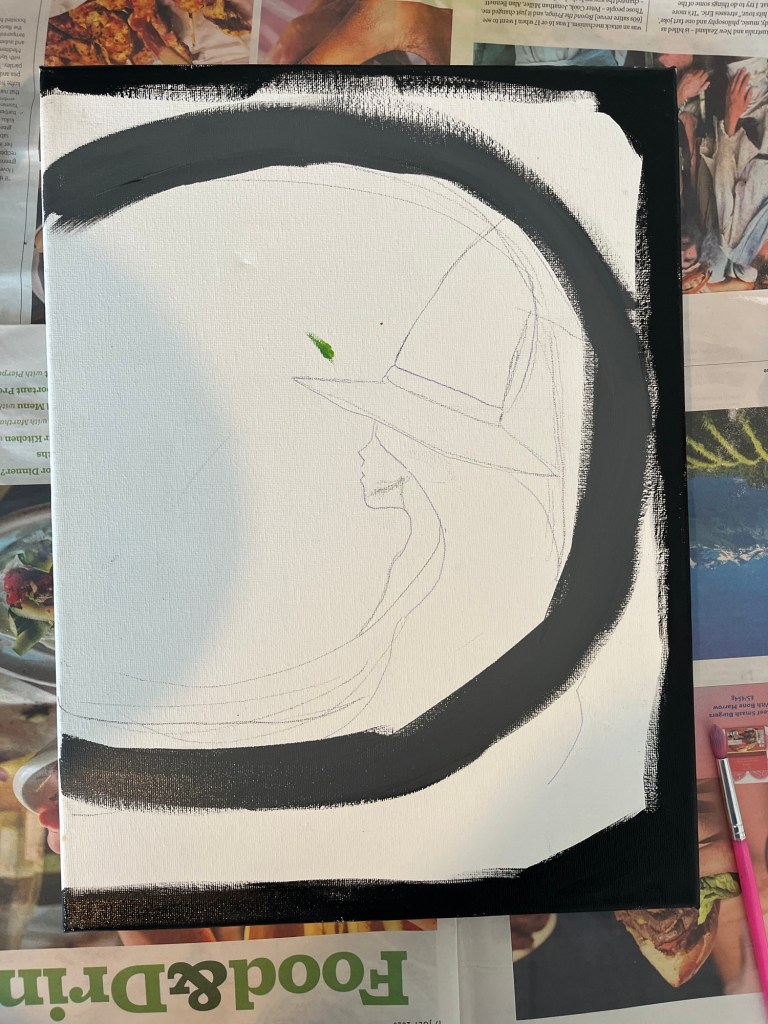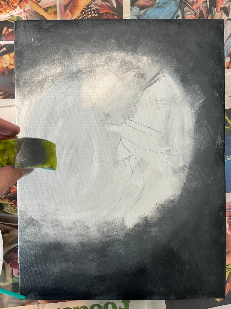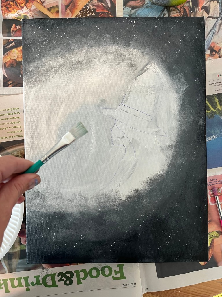 Then using a large brush fill the middle of the canvas with white paint. Roughly outlining the witch. It doesn’t matter if black gets in the mix.