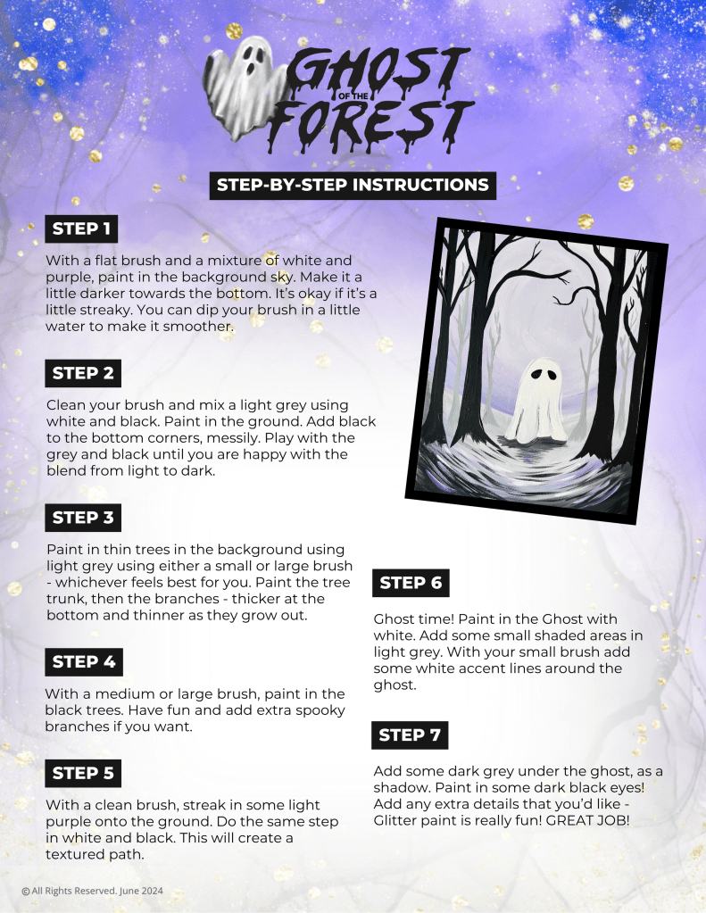 Step into the mysterious forest and paint your very own friendly ghost! This project is perfect for autumn evenings, Halloween fun, or anytime you feel like creating something a little spooky and a lot magical. Don’t worry if your brushstrokes aren’t perfect — ghosts love a bit of wobbly charm! Follow these simple steps and watch your haunted forest come to life.