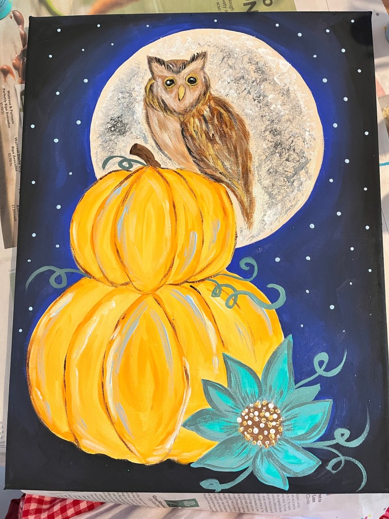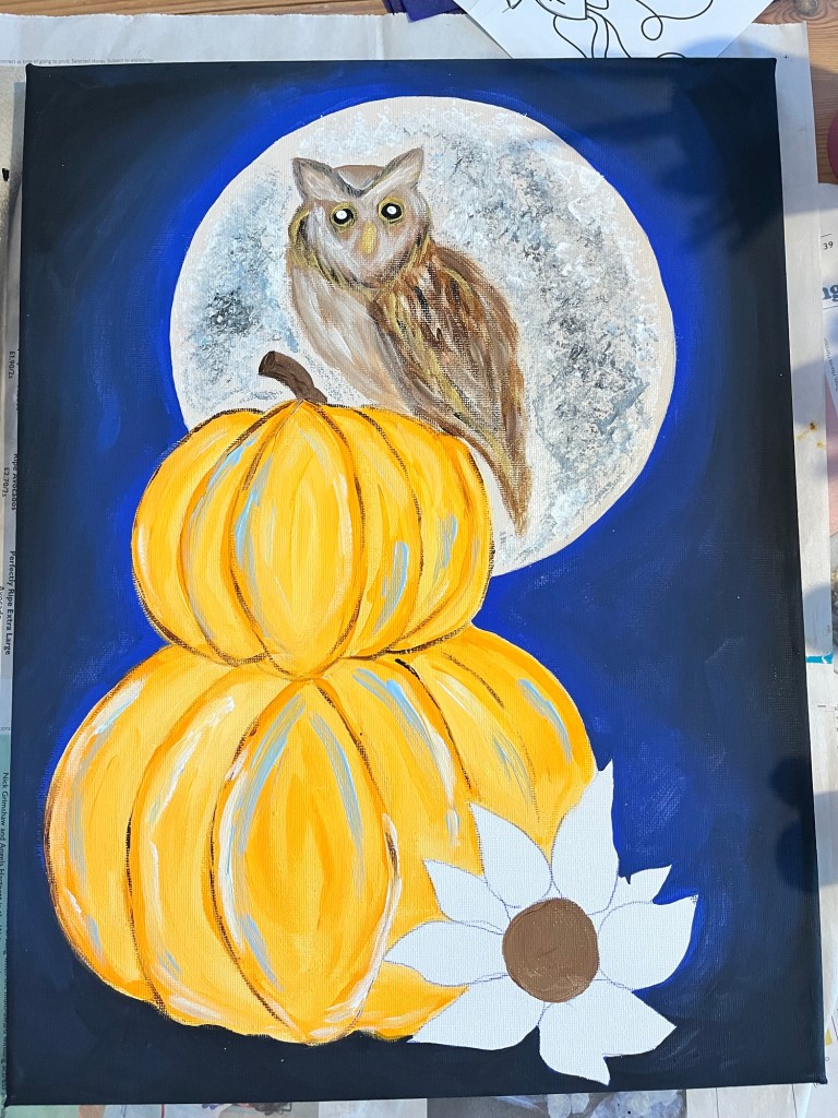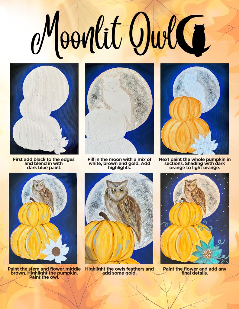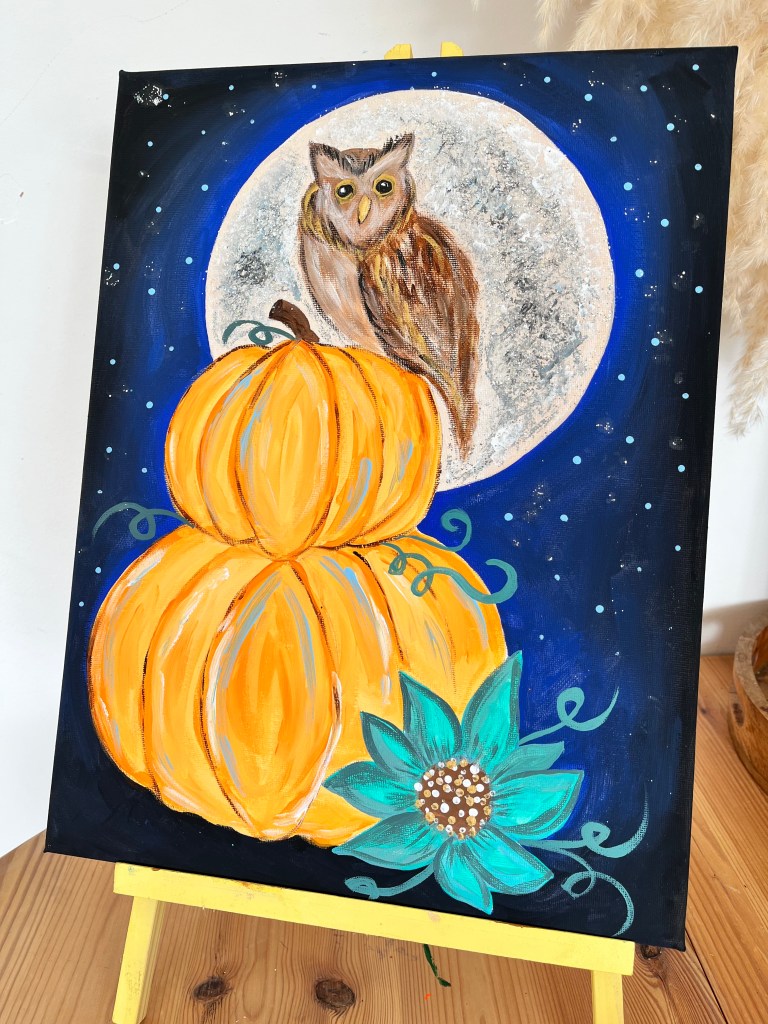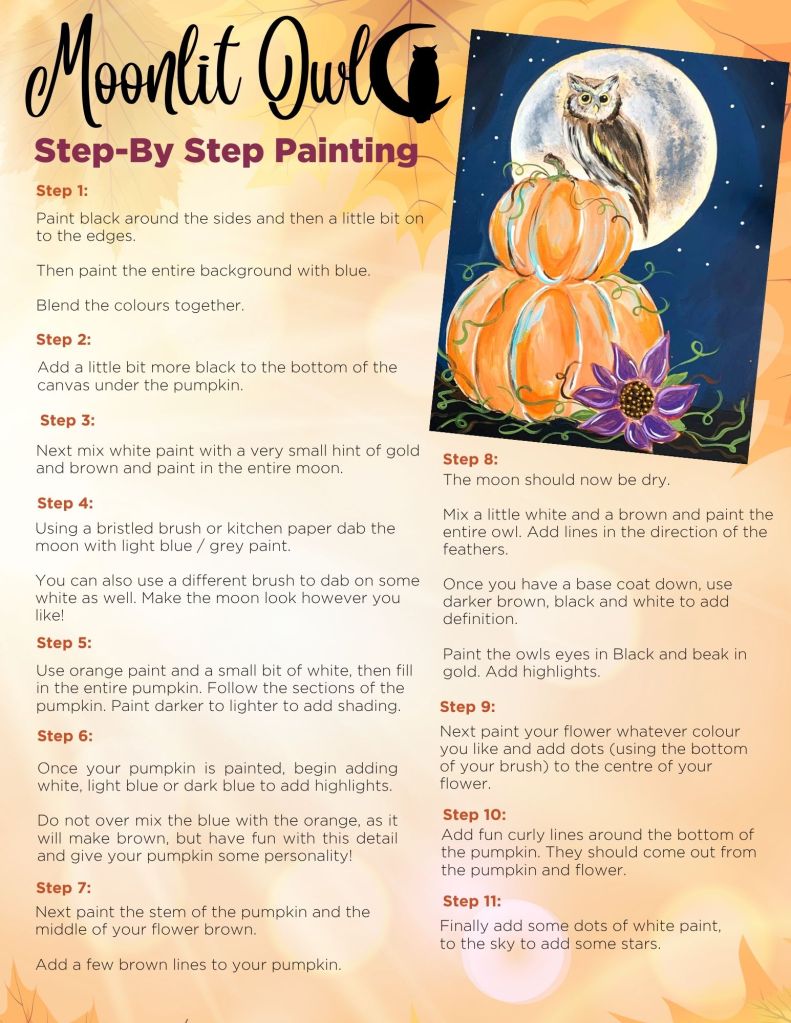 Welcome to your Moonlit Owl painting! We’ll be blending rich autumn tones and moonlight to create a cosy, magical scene featuring a wise owl perched on a glowing pumpkin. Whether you’re painting for fun, relaxation, or creativity, remember: there’s no right or wrong way to paint—just enjoy the process and let your imagination take flight.