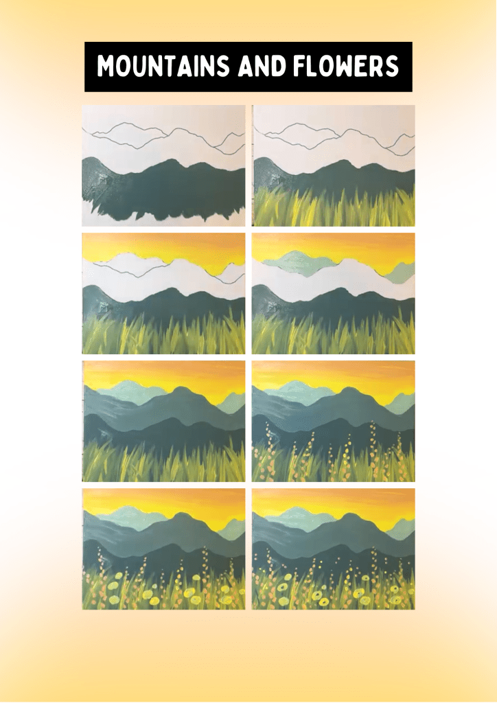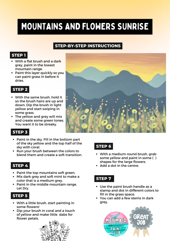 Welcome to your Mermaid Paint Club step-by-step guide for painting Mountains and Flowers! Below you’ll find instructions to help you create your very own masterpiece.