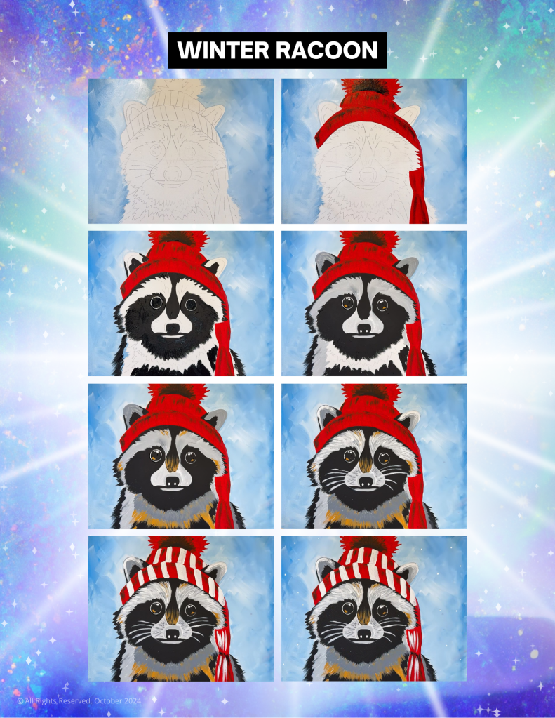 Before we dive into the steps, remember don’t stress about perfection, every painting has its own personality. Embrace those “happy accidents,” because unexpected brushstrokes can add charm and character. Most of all, enjoy the process—your Raccoon will be completely unique, and that’s what makes it so special!