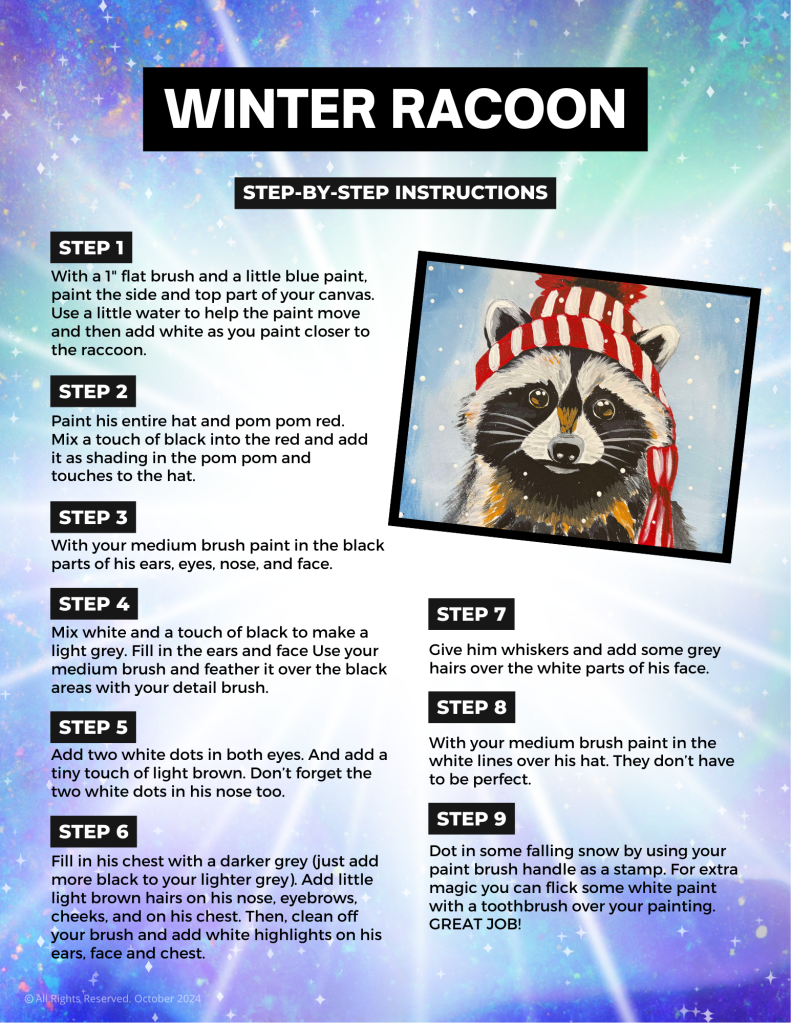 Welcome to your Mermaid Paint Club step-by-step guide for painting Winter Raccoon! Below you’ll find instructions to help you create your very own masterpiece.